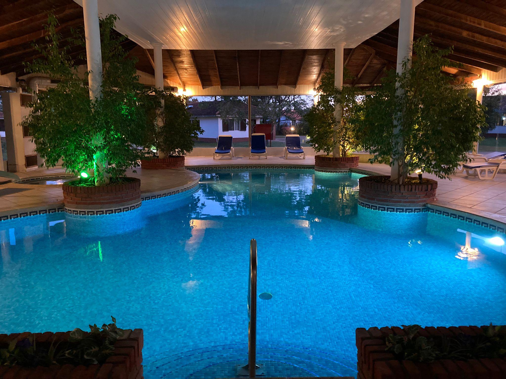 Exclusivas piscinas cubiertas y climatizadas. Hidromasaje a 38 C con amplios ventanales en entorno muy confortable. También hay una piscina infantil con tabla deslizante.